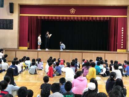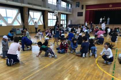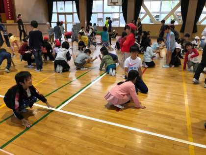木曜日の朝の時間は、児童集会を行っています。今日は集会委員のみなさんの企画で、「進化じゃんけん」をして盛り上がりました。まずは、集会委員さんがステージ上で、お手本を見せてくれました。最初は全員ネズミで、一度じゃんけんに勝つとウサギになります。次に勝つと、今度はクマです。もう一度勝つと人間になれるのです。先生も交じって笑顔がいっぱいの集会になりました。これで、1時間目からがんばることができそうです。