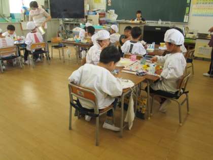 今年の校長経営戦略予算では、昨年度からの取組を継続して姿勢保持がしやすいクッションを全児童分購入するよう申請をしましたが、惜しくも次点となってしまい、満額をいただけませんでした。それでも、1・2年生全員分を購入することができました。写真にも写っている紺色のお座布団状のものです。みんなの背筋が伸びているのは、気のせいではありません。よい姿勢で給食をおいしくいただく、よい姿勢で集中力を長続きさせて学習する助けになっています。
