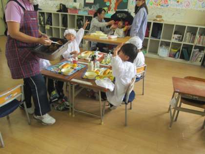 今日の献立は、なすのミートグラタン、鶏肉と野菜のスープ、みかんと色鮮やかなパンプキンパンでした。なすびが苦手な子どもも、カリッと焼けたパン粉と共にミートソースで食べると食が進み、「おかわりほしい人?」の声にさっと手が挙がりました。
