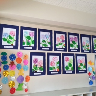 今、1年1組の教室の中は、子どもたちの描いたあじさいの花でいっぱいです。パスのいろいろな技法を使って楽しみながら仕上げました。はしに見えているのは、子どもたちが折り紙に切り込みを入れて作ったたくさんのかざりです。