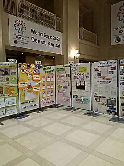 親子給食(小学校でつくった給食を中学校へ運ぶ)の様子のビデオ(約15分)や大阪市で行っている食育の授業の内容などの掲示があります。この食育展には、大阪市24区のうち6つの区が掲示をしており、今年は淀川区の栄養教諭が作成したものもあります。興味のある方はぜひ足をお運びいただきご覧いただければ、ありがたいです。