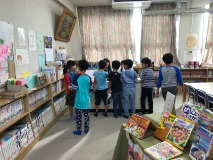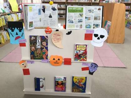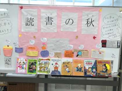学校図書館補助員のかたが季節にちなんだ本を、楽しい工夫をして展示してくださっています。そのおかげで、図書館は子どもたちにとってちょっと特別な楽しい空間になっています。