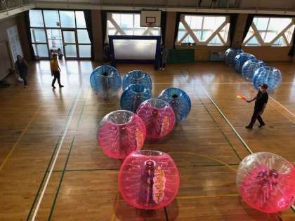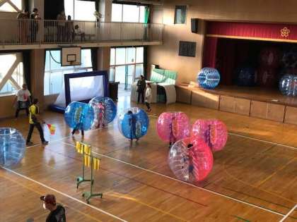 バブルサッカーの試合開始です。なんだかとてもかわいいのですが、ボールがどこにあるのかよくわかりません。プレーヤーには見えているのでしょうか。でも、とっても楽しそう^_^