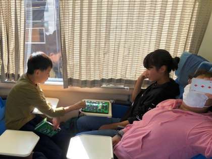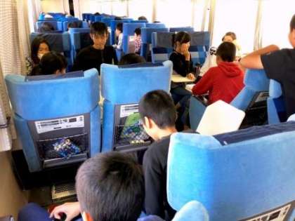 特急の車内では、さっそくUNOやトランプ、オセロゲームなどみんな友だちと楽しんでいます。