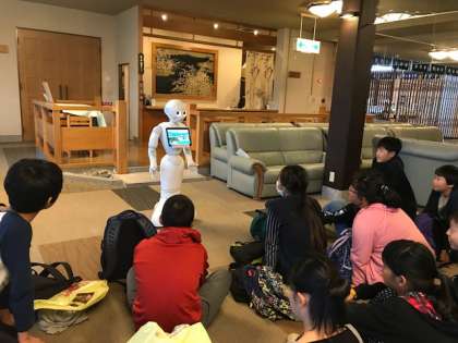 無事、全員そろって今晩お世話になる賢島パークホテル「みち潮」さんに到着しました。ペッパーくんがホテルの説明をしてくれています。