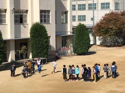 小春日和に誘われて、4年生が先生と一緒に全員で大縄とびをしています。十三小では、1番クラスの人数の多い4年生です。全員揃うと壮観です。
