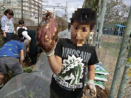 春に苗を植えたさつま芋収穫をしました。掘ってみるまでは、どれぐらい芋ができているのかは、わからないのでドキドキしながら抜きました。さつま芋の畝を挟んで2列に並び、一斉にツルをもって引きました。すると、大きなさつま芋がゴロゴロでてきたので、びっくり!土に埋まっている芋も手で掘って取り出そうとしていると、大きな白い幼虫も出てきて、びっくりする子、気持ち悪いと騒ぐ子。大騒ぎの芋堀でした。