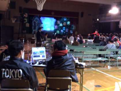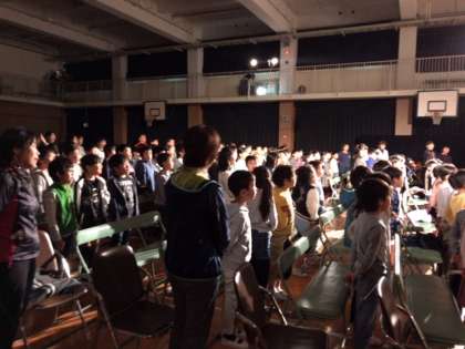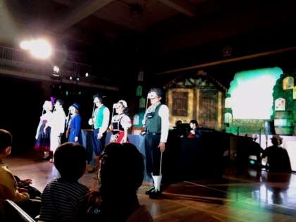 写真は子どもたちがすっかり様変わりした体育館に入ってきたところ、オペラ歌手のみなさんの紹介、そして劇中歌の練習です。