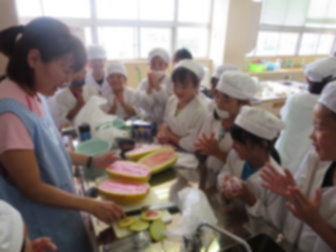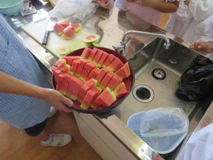 次に、期待を込めて、一番大きく育ったスイカを切ると、赤い色が目に飛び込んできて、大歓声があがりました。少しずつですが、クラス全員一切れずつ試食することができました。小さいながらも、甘くておいしいスイカでした。
