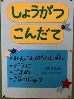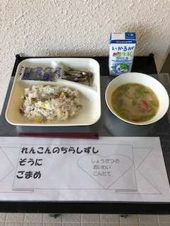 今日は、お正月の行事献立で、「れんこんのちらしずし、ぞう煮、ごまめ、牛乳」でした。