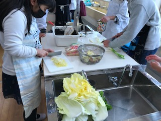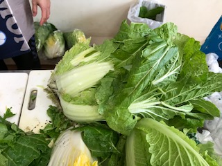 今年も十三ふれあい農園でとれた白菜を使って、5年生と6年生が鍋パーティーをしました。台風の暴風で阪急電車側の柵が傾いたため、畑の一部が使えなくなっていますが、それでもこんなに立派な白菜がたくさんできました。無農薬で育てたため、中にはナメクジがいて、子どもたちは葉を1枚ずつ丹念に洗いました。