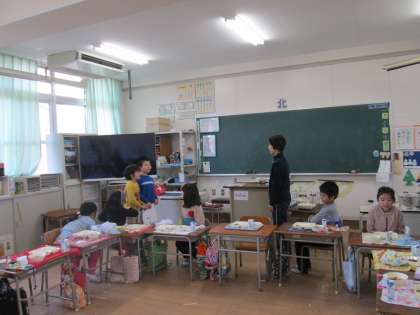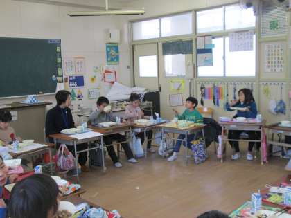 30日は3年生でした。みんなで食べ物しりとりをしながら給食を食べました。質問タイムでは、好きな色は?好きな動物は?好きな食べ物は?と給食以外のこともいろいろ知りたいことが次から次へとありました。