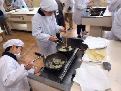 先生にやり方のお手本を見せていただいたら早速班に分かれてクッキング開始!班で協力して、スライスしたおいもさんの水気を取ったり、火加減を見たり、フライパンの上のおいもさんをひっくりがえしたりと、がんばりました。