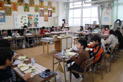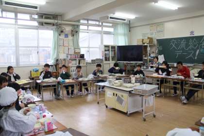 会食中は緊張したのか静かな雰囲気でした。会食が進むと会話も始まり、しりとりなどゲームをする班も見られました。