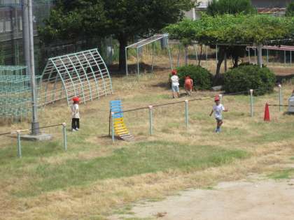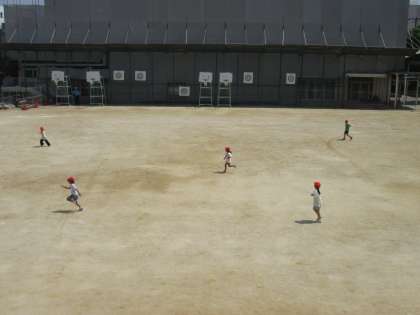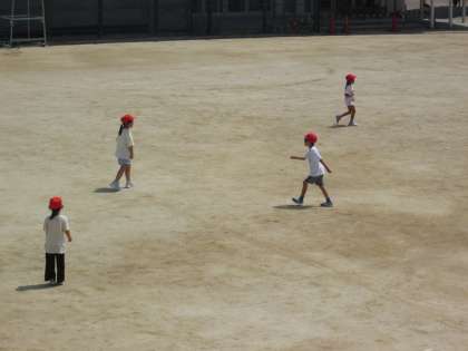 「だれが オニ?」、「タッチしたで。」と、可愛らしい声が聞こえてきます。たくさんの友達と一緒に遊ぶのは、夏休みにはできない楽しさですね。