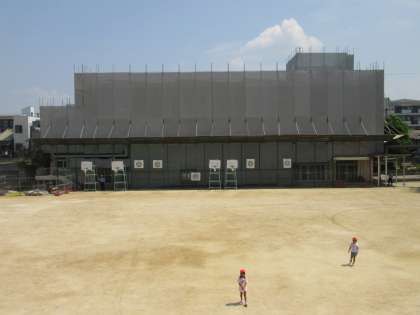 また、2学期なって登校して来た子ども達が驚いたのは、講堂全体がシートで覆われていたことです。講堂の周りに足場が組まれて、講堂の外壁を全面塗装しなおします。