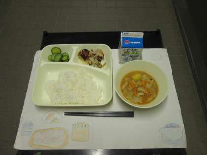 今日は「鶏肉の塩こうじ焼き、さつまいものみそ汁、きゅうりの甘酢あえ、ごはん、牛乳」でした。鶏肉とたまねぎと塩こうじを混ぜ合わせて焼き物機で焼きました。味付けは塩こうじだけでしたが、たまねぎの甘味がよくわかる味付けでした。しっとり焼き上がり、ごはんによく合いました。それとあまいさつまいもが入って、赤みそをきかせたさつまいものみそ汁と、さっぱりとしたきゅうりの甘酢あえの組み合わせでした。
