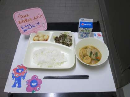 今日は「一口がんもとさといものみそ煮、牛肉と野菜のいためもの、みたらしだんご、ごはん、牛乳」でした。みそ煮は味がよくしみてごはんによく合いました。炒めものは塩としょうゆだけのシンプルな味付けでしたが、ピーマンが苦手な児童もよく食べていました。それとデザートにみたらしだんごがつきました。もちもちでとても人気がありました。