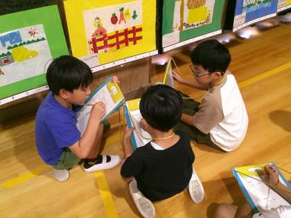 1年生の子ども達もたんけんバッグを首からかけて、講堂にずらりと並んだ作品を見ました。お友達の絵の良いところを見つけたら、ワークプリントに書いていきます。色や形のくふうをたくさん見つけることができました。