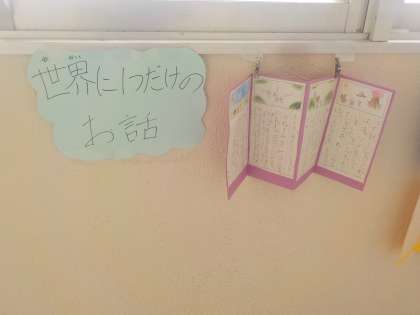 2年生の教室の前を通るとカラフルな作品が展示されていて、その横には『世界に1つだけのお話』と作品のタイトルが貼られています。