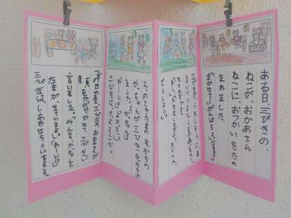 国語の授業で2年生の子ども達がお話を考えて、絵本をつくたようです。一つ一つを鑑賞してみると、お話の中に2年生の子が登場しているお話や、クリスマスやバーベキューといった楽しい場面を描いたお話など、バラエティーに富んでいて面白かったです。