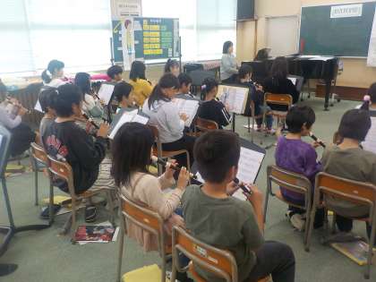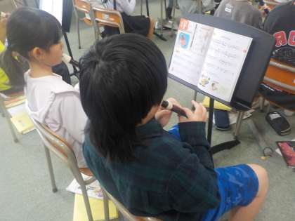 4年生の音楽の授業をのぞくと、これまで練習してきた曲を次から次へと吹いて聴かせてくれました。「♪オーラリー」、「♪山の音楽家」、「♪よろこびの歌」、昭和から続くアニメのテーマ曲などなど。