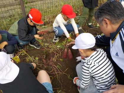 1年生の子ども達にとって、芋ほりはまるで宝探しです。土の中にどんなお宝(サツマイモ)が隠れているかわからないので、ドキドキとワクワクが止まりません。お芋の頭が見えると、そのまわりをどんどん掘って、お宝をゲット。サツマイモが取れるたびに、1年生の子ども達から嬉しそうな声があがりました。