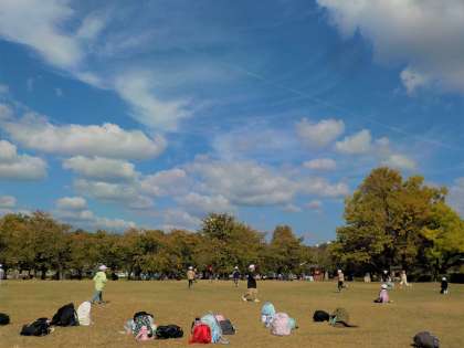 展示館の見学を終えた後は、万博公園の芝生広場でお弁当&おやつタイムにしました。青空が広がり風もさわやかで、最高の遠足日和です。お友達と輪になって敷き物を並べ、お家から持ってきたお弁当を広げて美味しくいただきました。