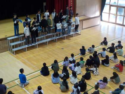 6年生と5年生が中心になって、十三小学校の歴史や町の様子を表す言葉を集め、歌詞をつくりました。校長先生の紹介に続けて、6年生がひな段に並んで『100周年の歌』を発表しました。