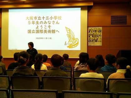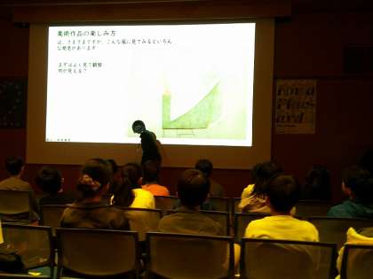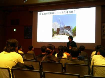 まずは、多目的ホールに入り、学芸員さんから国際美術館の歴史や館内の様子について教えていただいたり、これからの見学のポイントとなる美術作品の見方、楽しみ方について教えていただきました。