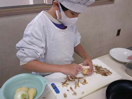 家庭科の調理実習で、「野菜いためと目玉焼き」をつくりました。まずは玉ねぎやジャガイモ、ハムを食べやすい大きさに切っていきます。