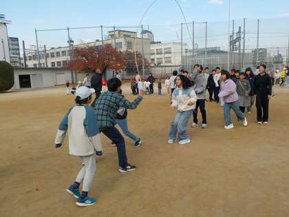 3分間にクラスで大縄跳びを跳んだ(低学年は通りぬけた)回数を、最後に全学年で足します。今年度の『おおなわチャレンジ」の記録は1日目が579回、2日目が563回、3回目が696回。