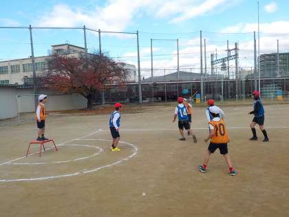 スポーツ出前講座の後半は、習ったチェスト・パスを使ってゲームです。クラスを4色のゼッケンで分けて、ゲームをしました。