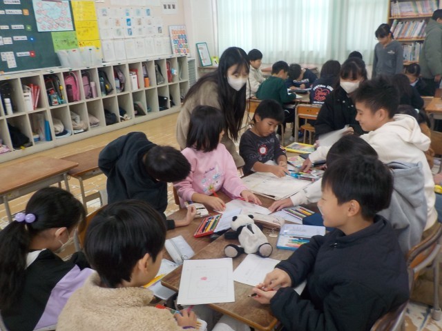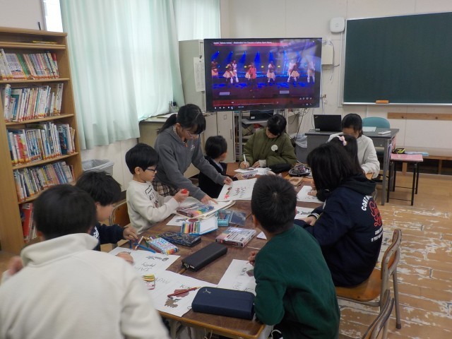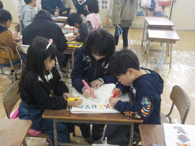 なかよし班活動のバッグづくりでは、教室でケニアの楽し気な歌を流して、子ども達も口ずさみながら色塗りをしました。遠く離れたケニアの子ども達が、このバッグを背負って学校に通う場面を想像するだけでワクワクしてきますね。
