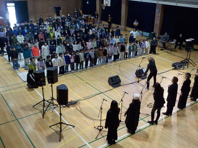 「今日はみんなと一緒に歌をうたいたいと思ってきました。めちゃめちゃいい歌、ビリーブを一緒に歌いましょう」。全学年の子ども達も立って、ヒューマンノートのみなさんと「♪ビリーブ」の合唱をしました。子ども達の可愛らしい歌に、コーラスのみなさんがキラキラとした飾りをつけてくださって、優しい言葉と美しい響きが講堂いっぱいに広がりました。
