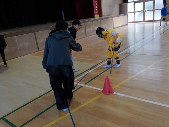 お爺ちゃん、お婆ちゃんになって、講堂に作られたコースを歩いてみます。まずは、腰が伸びないので、ずっと前かがみの姿勢がとてもしんどいです。ベストに入った重りがずっしりと重いし、肘と膝は巻いたサポーターのために曲がりにくくて、歩くとにバランスを崩しそうになります。サポートしてくれるお友達の声も聞こえにくくて、まるで遠くでしゃべっているようです。お皿の上のおはじきをスプーンですくって移す動作も、ゴーグルで白くぼんやりしか見えないうえに、手首の重りが重くてスイスイとできません。