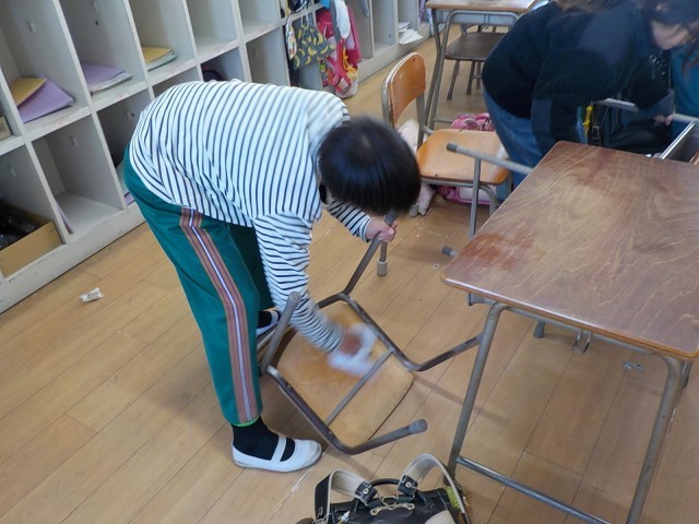 荷物がまとまったら、次はぞうきんできれいに拭きます。机やイスもひっくり返して、ふだんは掃除しないような所までピカピカにしました。