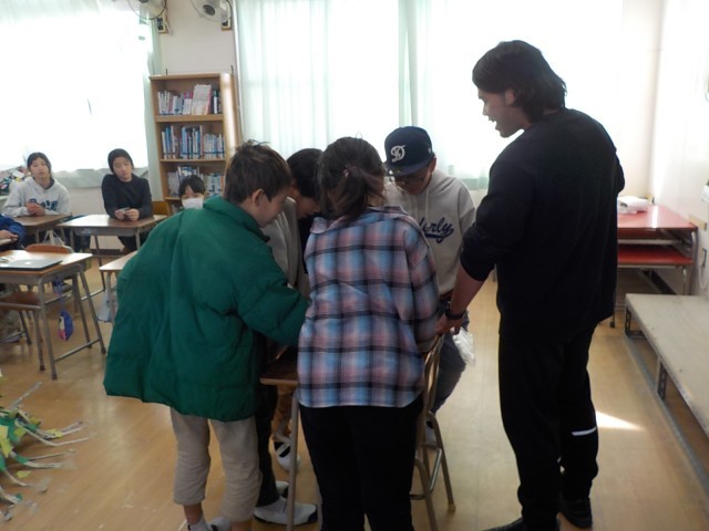 ジャンケンで勝った子は前に出て、先生からのプレゼントをもらいます。可愛らしいキーホルダーや、本物のようなきれいな熱帯業の置物は、先生が種子島に行ったときのお土産だそうです。