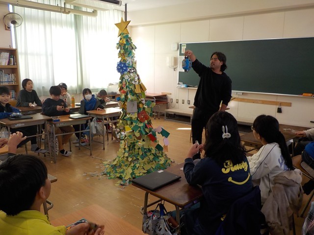 5年生の教室の真ん中には、子ども達の背丈よりも高くて大きな手作りクリスマス・ツリーが飾られています。それを囲むようにして先生と子ども達のジャンケン大会で大盛り上がりでした。
