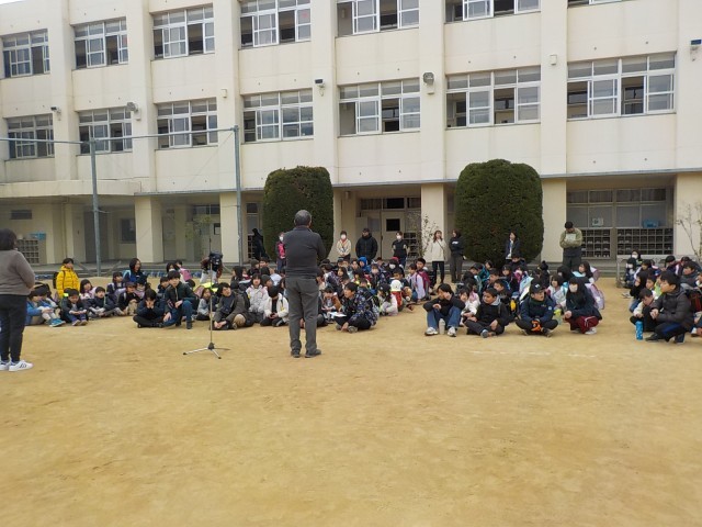地区児童会の後半には、集団下校を行います。まずは運動場に集まり、校長先生のお話を聞きました。