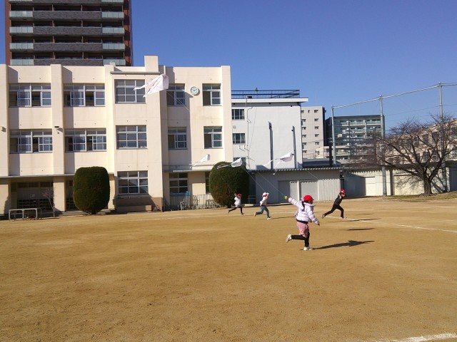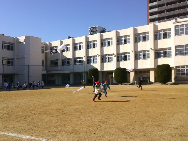 運動場から聞こえてくる、1年生の楽しそうな声。はじめは体育の授業かと思いましたが、1年生の子ども達がはしゃいでいたのは生活科の凧あげでした。