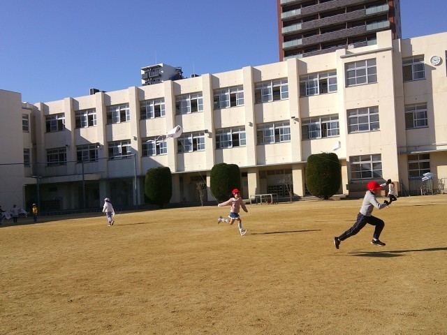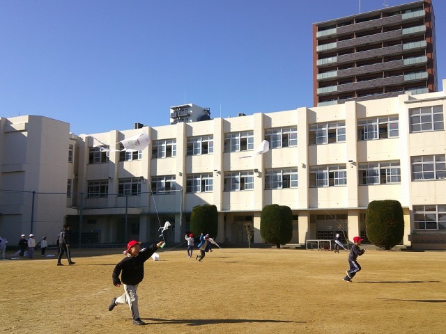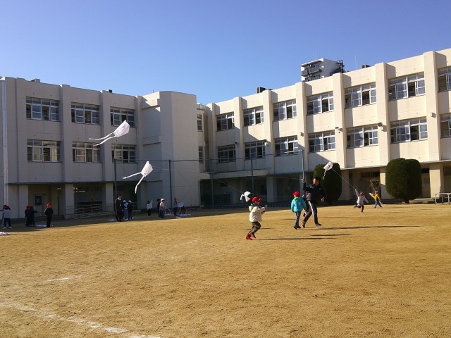 今日も風のある日だったので、子ども達が少し走るだけで凧はグングンと空にあがっていきます。中には校舎の2階を越えるぐらい高く揚がっていく凧もありました。