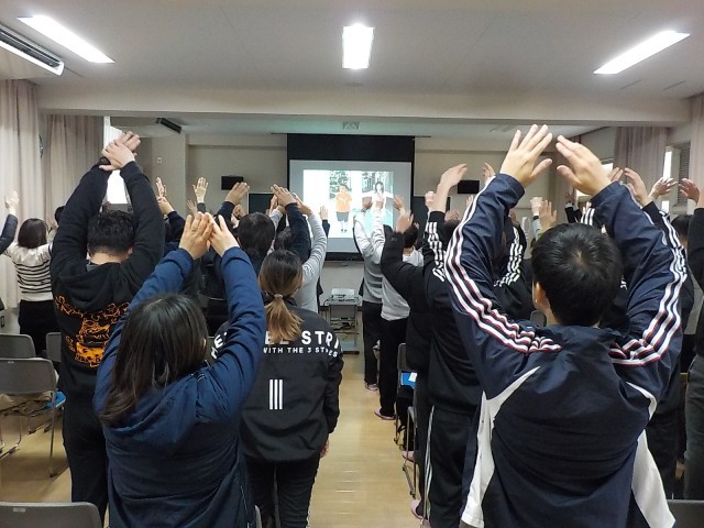 まずは本校の取り組みとして、姿勢を維持するための体幹をトレーニングする体操を紹介しました。昨年度、健康委員会の児童の発案で、毎週月曜日の児童朝会の最後に「体幹のびのび体操」をしています。その実践の紹介をし、健康委員会の児童が作成した動画を流して、研究発表会に参加されているみなさんと実際に体幹のびのび体操をしました。