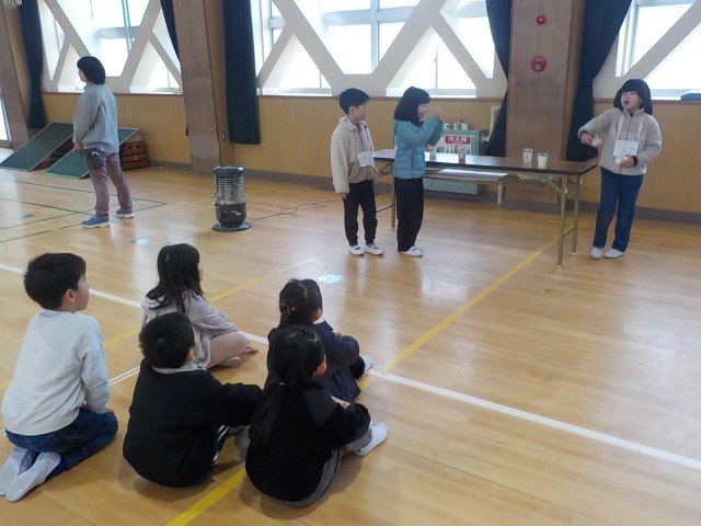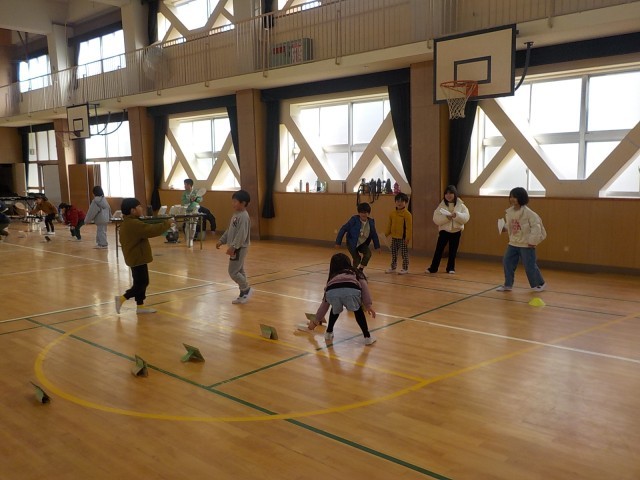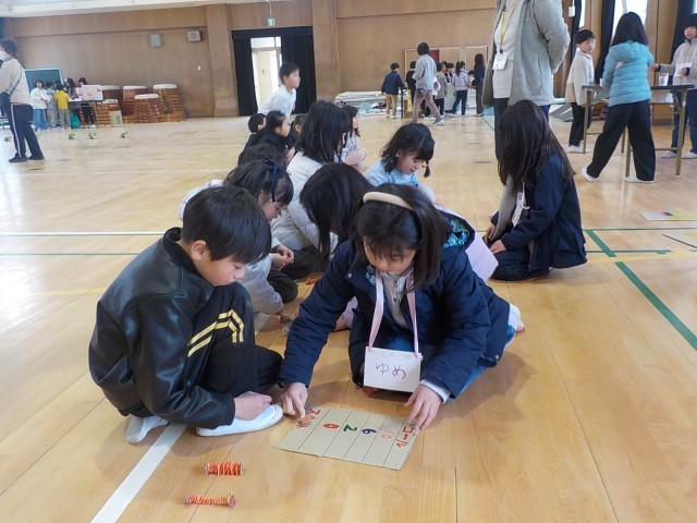 1年生も5つのグループに分かれて、遊びのコーナーを回っていきます。それぞれのコーナーでは始めに2年生が自己紹介をしてから、お手本を見せながら遊び方をやさしく教えてくれます。ピョーンッと跳ぶ紙のおもちゃや、コロコロと不思議な動き方で坂道を転がるおもちゃなど、とっても面白そうなおもちゃばかりです。