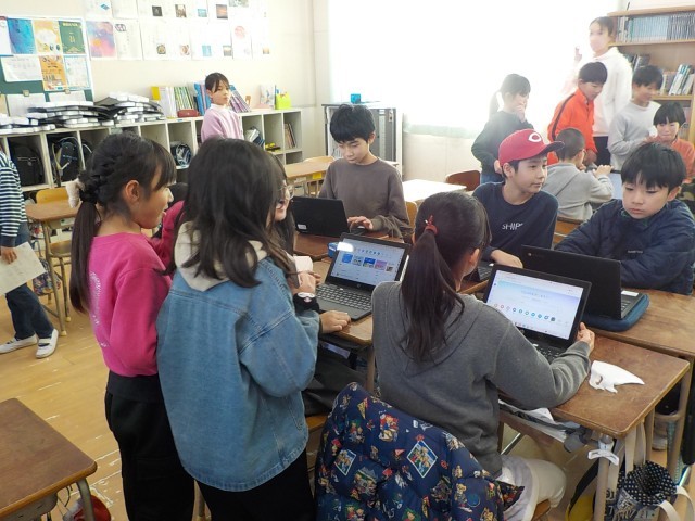 プログラミング クラブでは、新しいソフトや楽しいアプリを紹介するプレゼンテーションを、グループで協力して作成していました。上級生が学習者用端末を操作をして、色々な操作をして表現を見せてくれました。