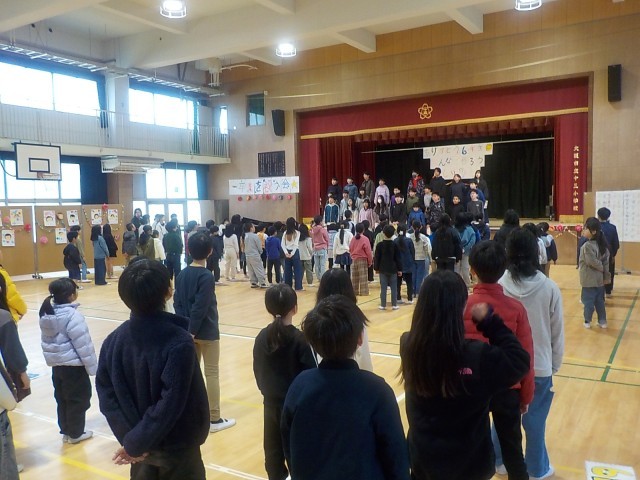 次は6年生からお返しのプレゼントです。美しい歌声の合唱を講堂に響かせて、下級生のみんなに聴かせてくれました。拍手とともにアンコールがかかると、来年度の創立100周年に向けて、高学年が中心になって作詞した『♪100周年の歌』を披露してくれました。新しい1年生を4月に迎えて、来年度はこの『♪100周年の歌』を受け継いでいきます。