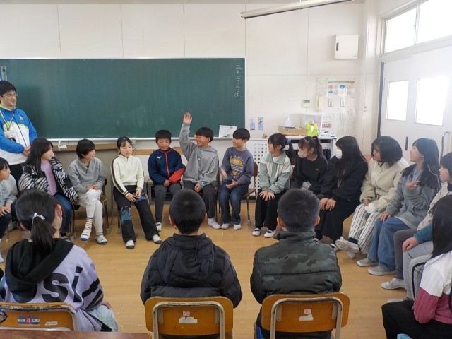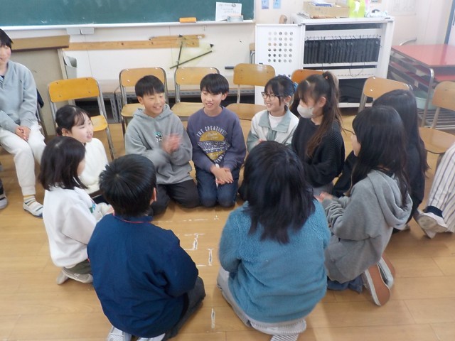 一年の最後の日、みんなでお楽しみ会をして遊びました。ちょうど教室をのぞいた時には、みんなでイスを丸並べて「いらっしゃいませゲーム」をしていました。一人が手を上げて「ひとり来ました」、隣の二人が手を上げて「ふたり来ました」、また隣の3人が手を上げて「さんにん来ました」、次はみんなで「いらっしゃませー!」。途切れずに続いていくと、どんどん楽しく盛り上がっていきました。