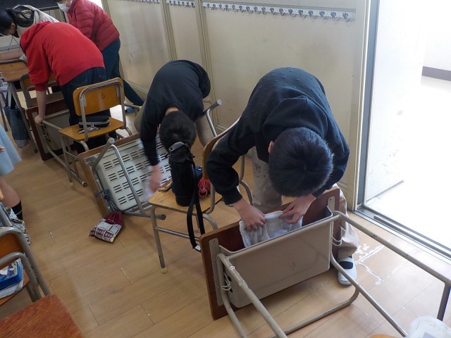 5年生の子ども達も教室の大掃除をしていました。ぞうきんで机の上や引き出しの中、イスの脚まで一生懸命に拭くと、真っ白だったぞうきんが真っ黒に。それだけ汚れがとれたという証です。次の学年の子ども達に気持ち良く使ってもらえるように頑張りました。