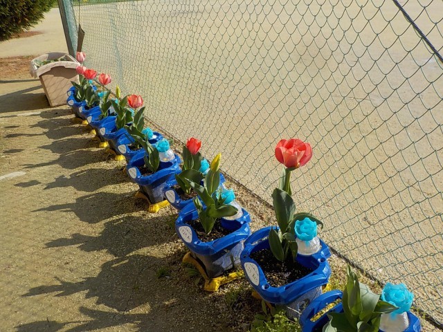 創立100周年を迎える十三小学校の春は、彩り豊かに訪れました。入学式に合わせるように桜の花が満開に咲きました。そして校庭の北側の線路沿いには昨年の6年生が心を込めて育てた菜の花が一面に咲き誇り、まるで黄色いじゅうたんのような美しい景色が広がっています。また、1年生が生活科で植えたチューリップも可愛らしい花を咲かせて、子ども達が笑顔で登校してくるのを待っています。