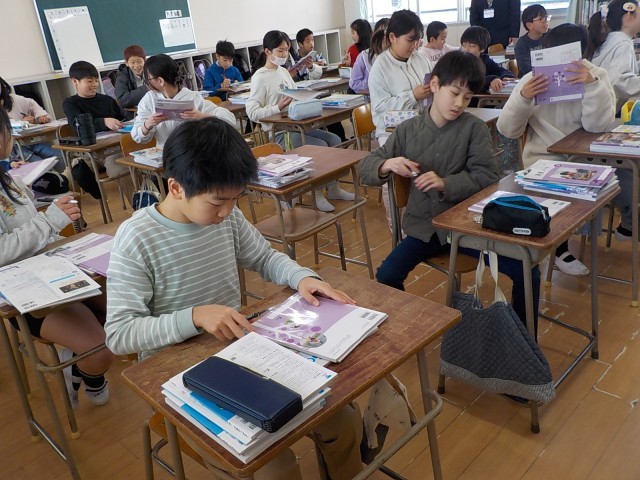 6年生にも教科書が配られて、机の上に大きくて厚い教科書が積まれていました。高学年になると、一年間を通して使う教科書もあります。ネームペンを出して、すべての新しい教科書に丁寧に記名をしていました。